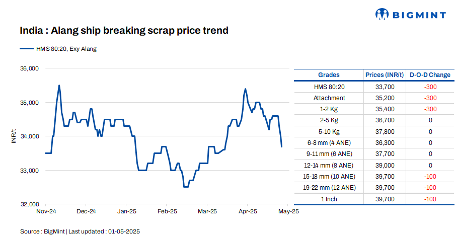 Ship-breaking melting scrap prices in Gujarat’s Alang market decreased by INR 300/t d-o-d on 1 May’25. According to BigMint’s assessment, HMS (80:20) stood at INR 33,700/t ($398/t) ex-yard. The price drop can be attributed to subdued demand for both semi-finished and finished steel in yesterday’s trading session, which, along with moderate scrap trading activity, prompted suppliers to adjust their offers downward.