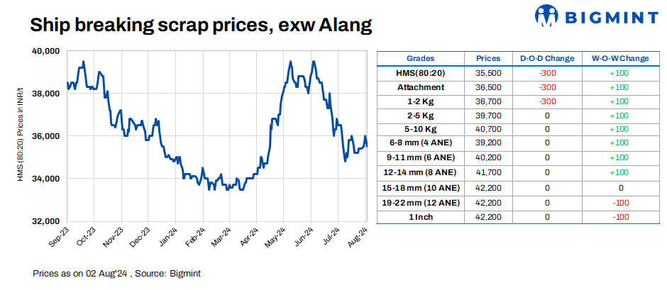 Ship-breaking melting scrap prices in Gujarat’s Alang market decreased by INR 300/t d-o-d on 2 Aug’24. According to BigMint’s assessment, HMS (80:20) prices stand at INR 35,500/t ($424/t) ex-yard. Limited demand for semi-finished and finished steel were observed in the region during yesterday’s trading session. Additionally, average trade activity in scrap prompted suppliers to reduce their offers today.