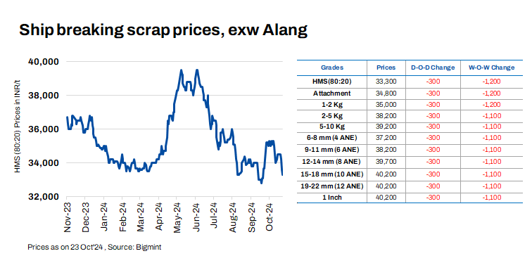 Ship-breaking melting scrap prices in Gujarat’s Alang market decreased by INR 300/t d-o-d on 23 Oct’24. According to BigMint’s assessment, HMS (80:20) prices stood at INR 33,300/t ($396/t) ex-yard. Limited demand for semi-finished and finished steel was observed in the region during yesterday’s trading session. Additionally, average trade activity in scrap prompted suppliers to reduce their offers today.