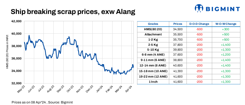 Ship-breaking melting scrap prices in Gujarat’s Alang declined by INR 500/t d-o-d on 8 Apr’24, as per BigMint’s evaluation. HMS (80:20) prices were recorded at INR 34,500/t ex-yard. In yesterday’s trading session, semi-finished steel prices dropped, while finished steel prices were stable. Price disparities between buyers and sellers were evident in the Alang market.