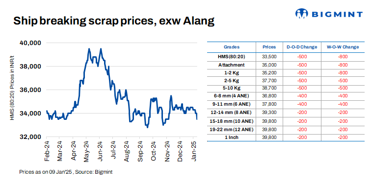 Ship-breaking melting scrap prices in Gujarat’s Alang market decreased by INR 500/t d-o-d on 9 Jan’25. According to BigMint’s assessment, HMS (80:20) prices stood at INR 33,500/t ($390/t) ex-yard. Following a period of limited trade in semi-finished and finished steel, prices in the region decreased. Average trade activity in scrap further dampened market sentiment, prompting suppliers to reduce their offers today.