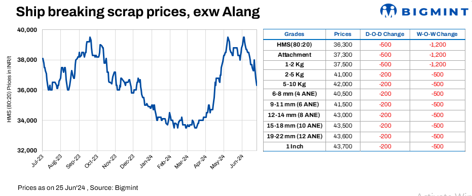 As per BigMint assessment, ship-breaking melting scrap prices in Gujarat’s Alang market fell by INR 500/t ($6/t) d-o-d on 25 Jun’24. HMS (80:20) was evaluated at INR 36,300/t exy. Scrap prices moved down for the third straight day. Demand for semi-finished and finished steel during yesterday’s trading session remained limited, along with restricted trade activity in scrap prompted the suppliers to lower their offers today.