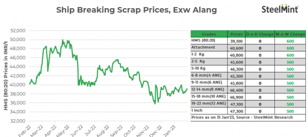 Ship-breaking melting scrap prices remained stable d-o-d today in Gujarat’s Alang market. As per SteelMint’s assessment, HMS (80:20) prices stand at INR 39,100/t exy. Moderate trade for semis and finished steel in the last trading session and decent bookings for scrap seen at the current price levels prompted sellers to keep offers stable.