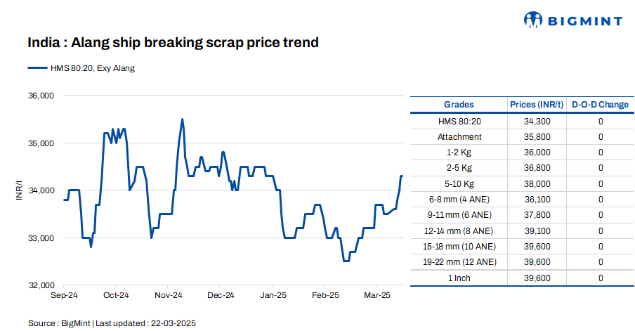 Ship-breaking melting scrap prices in Alang, Gujarat, remained stable d-o-d on 22 Mar’25. According to BigMint’s assessment, HMS (80:20) prices were at INR 34,300/t ($399/t) ex-yard. The region saw moderate trade activity for semi-finished and finished steel in yesterday’s trading session. This, along with consistent buying interest for scrap, led suppliers to maintain stable prices today.
