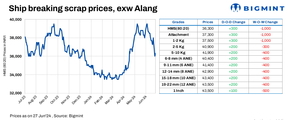 Ship-breaking melting scrap prices in Gujarat’s Alang increased by INR 300/t d-o-d on 27 June’24, as per BigMint’s assessment. HMS (80:20) prices were assessed at INR 36,300/t ($435/t) exy. During the second half of yesterday’s trading session, semi-finished steel prices increased in the region. Additionally, strong buying inquiries for scrap from induction furnace mills in Bhavnagar prompted scrap suppliers to raise their offers today.
