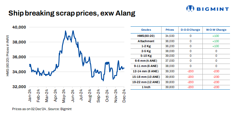 Ship-breaking melting scrap prices in Alang, Gujarat, held steady for the third consecutive day on 2 Dec’24. According to BigMint’s assessment, HMS (80:20) stood at INR 34,500/t ($407/t) ex-yard. Prices of semi-finished and finished steel also remained firm during the previous trading session. This, along with moderate trade activity in scrap, encouraged suppliers to maintain stable prices.