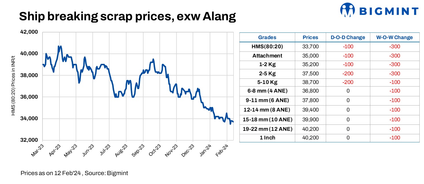 Ship-breaking melting scrap prices inched down by INR 100/t d-o-d in Gujarat’s Alang market on 12 Feb’24. BigMint assessed opening prices of HMS (80:20) at INR 33,700/t ex-yard. Limited trade in semi-finished and finished steel in the last trading session, coupled with moderate buying inquiries for scrap prompted suppliers to reduce offers today.
