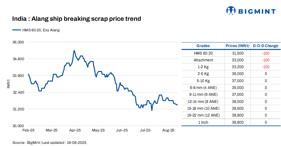 Ship-breaking melting scrap prices in Gujarat’s Alang market fell by INR 100/t d-o-d on 18 Aug’25, according to BigMint’s assessment. HMS (80:20) prices stood at INR 31,500/t ($360/t) exy. Trade activities in the steel market were sluggish due to the long weekend and recent festivals, resulting in slower movement in steel. Meanwhile, average trade activity in scrap prompted suppliers to reduce their offers today.