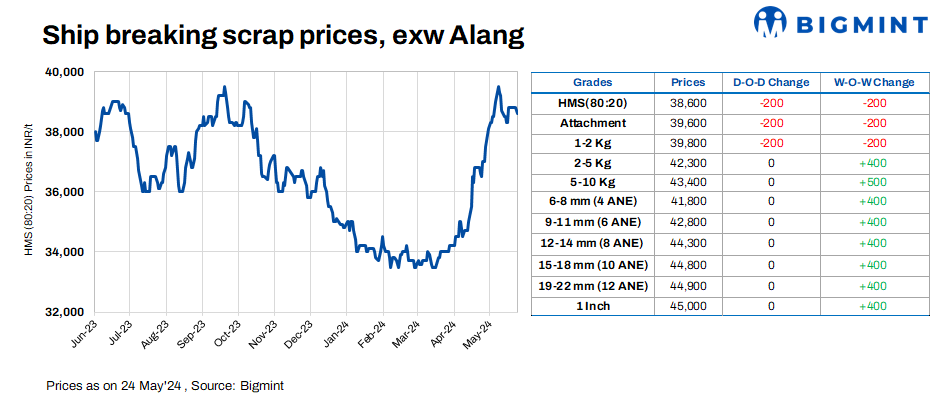 Ship-breaking melting scrap prices in Gujarat’s Alang market fell by INR 200/t d-o-d on 24 May’24, according to BigMint’s assessment. HMS (80:20) prices were assessed at INR 38,600/t exy. Semi-finished steel prices fell by around INR 100-200/t in the region in yesterday’s trading session along with moderate trade activities in scrap prompted suppliers to reduce their offers today.