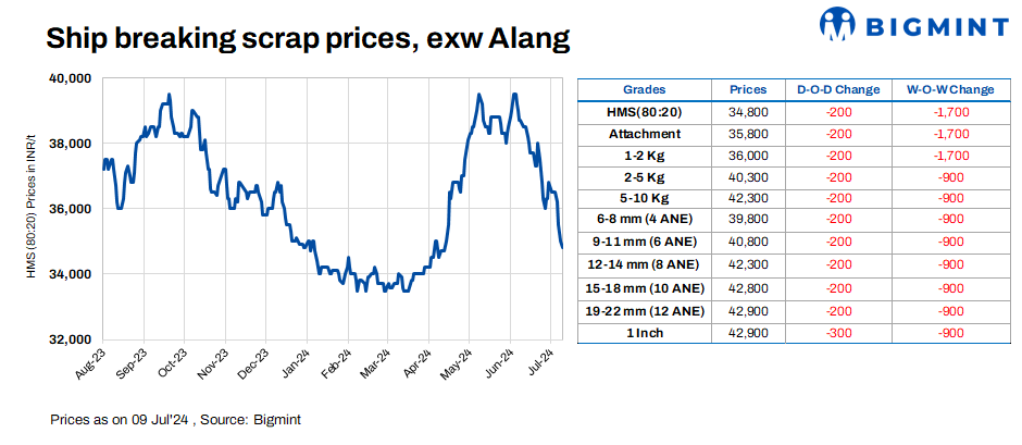 Ship-breaking melting scrap prices in Gujarat’s Alang market decreased by INR 200/t d-o-d on 9 Jul’24. According to BigMint’s assessment, HMS (80:20) prices stand at INR 34,800/t ($417/t) ex-yard. In yesterday’s trading session, semi-finished and finished steel saw need-based trade activity in the region. Coupled with the ongoing bid-offer disparity for scrap, this situation has led scrap suppliers to reduce their offers today.