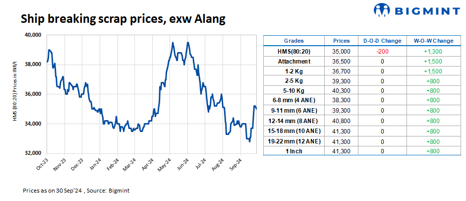 Ship-breaking melting scrap prices in Gujarat’s Alang market decreased by INR 200/t d-o-d on 30 Sep’24. According to BigMint’s assessment, HMS (80:20) prices stood at INR 35,000/t ($418/t) ex-yard. Need-based buying was observed in semi-finished and finished steel during the previous trading session. Additionally, moderate trade activity in scrap prompted suppliers to reduce their offers today.