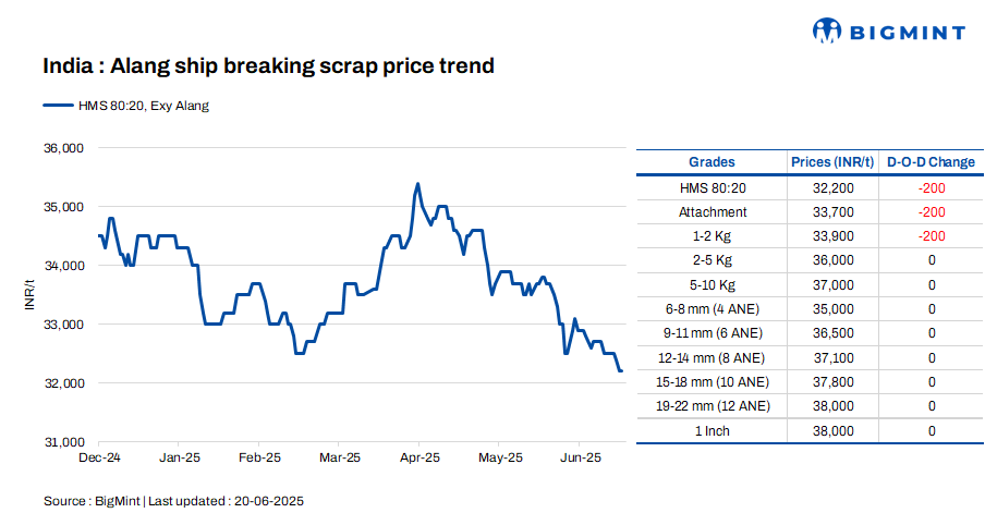 Ship-breaking melting scrap prices in Gujarat’s Alang market decreased by INR 200/t d-o-d on 20 Jun’25. According to BigMint’s assessment, HMS (80:20) prices stood at INR 32,200/t ($372/t) ex-yard. Semi-finished and finished steel prices dropped by INR 100-200/t in the region due to limited trade activities, which, along with average scrap trading activity, prompted suppliers to adjust their offers downward.