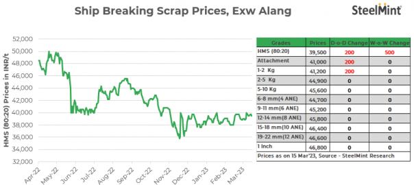 Ship-breaking melting scrap prices declined by INR 200/t d-o-d in Gujarat’s Alang on 15 Mar’23, as per SteelMint assessment. HMS (80:20) prices are assessed at INR 39,500/t exy. Limited trade in semi-finished and finished steel in the region coupled with limited buying inquiries for scrap, forced suppliers to reduce their offers today.