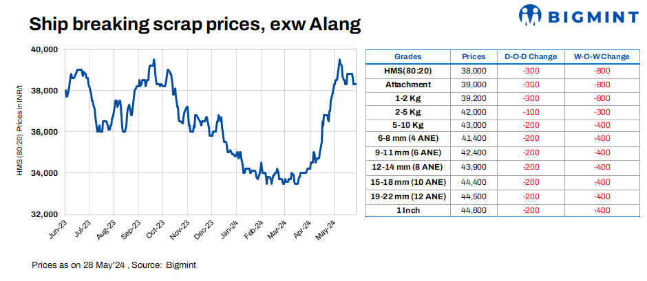 Ship-breaking melting scrap prices in Gujarat’s Alang market fell by INR 300/t d-o-d on 28 May’24, according to BigMint’s assessment, HMS (80:20) prices were assessed at INR 38,000/t ($457/t) exy. Semi-finished steel prices fell by around INR 100-300/t in the region in yesterday’s trading session. This, coupled with moderate trade activities in scrap, prompted suppliers to reduce their offers today.