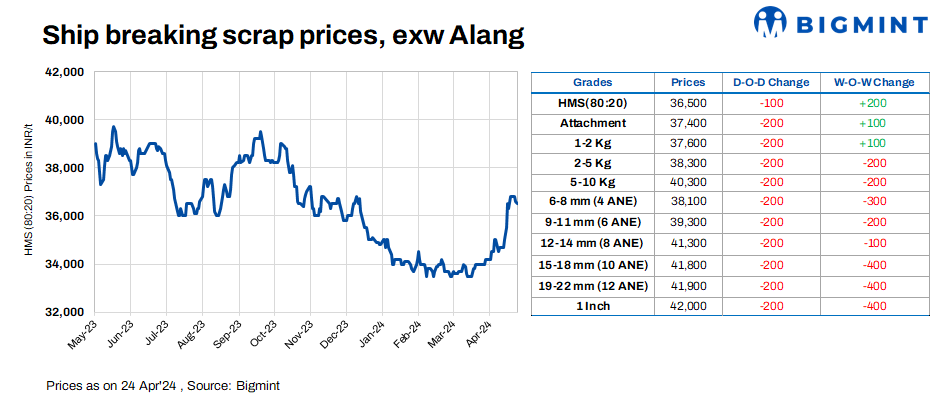 Ship-breaking melting scrap prices in Gujarat’s Alang market fell by INR 100/t d-o-d on 24 Apr’24, according to BigMint’s assessment. HMS (80:20) prices were assessed at INR 36,500/t exy. Semi-finished steel prices fell by around INR 100-200/t in the region in yesterday’s trading session along with moderate trade activities in scrap prompted suppliers to reduce their offers today.