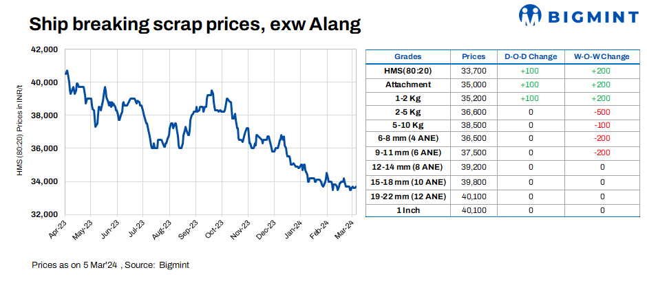 Ship-breaking melting scrap prices in Gujarat’s Alang inched up by INR 100/t d-o-d on 5 Mar’24, as per BigMint’s assessment. HMS (80:20) prices were assessed at INR 33,700/t exy. Active trade in the semi-finished and finished steel segments in key markets of the region, coupled with moderate activity in the scrap sector, prompted suppliers to increase prices today.