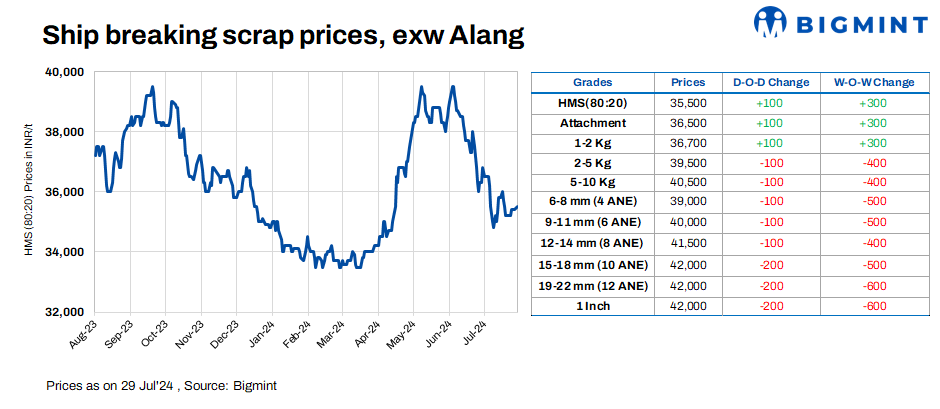 Ship-breaking melting scrap prices in Gujarat’s Alang market inched up by INR 100/t d-o-d on 29 Jul’24, as per BigMint’s assessment. HMS (80:20) prices were assessed at INR 35,500/t ($424/t) exy. Semi-finished steel prices increased by INR 200/t in the region during the last trading session. Additionally, moderate buying inquiries for scrap prompted suppliers to raise their offers today.