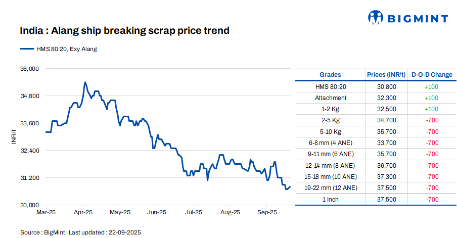 Ship-breaking melting scrap prices in Gujarat’s Alang inched up by INR 100/t d-o-d on 22 Sep’25, as per BigMint’s assessment. HMS (80:20) prices were assessed at INR 30,800/t ($349/t) exy. Trade activities in semi-finished and finished steel improved in the previous trading session in the region. Additionally, decent buying inquiries for scrap prompted suppliers to increase their offers today.