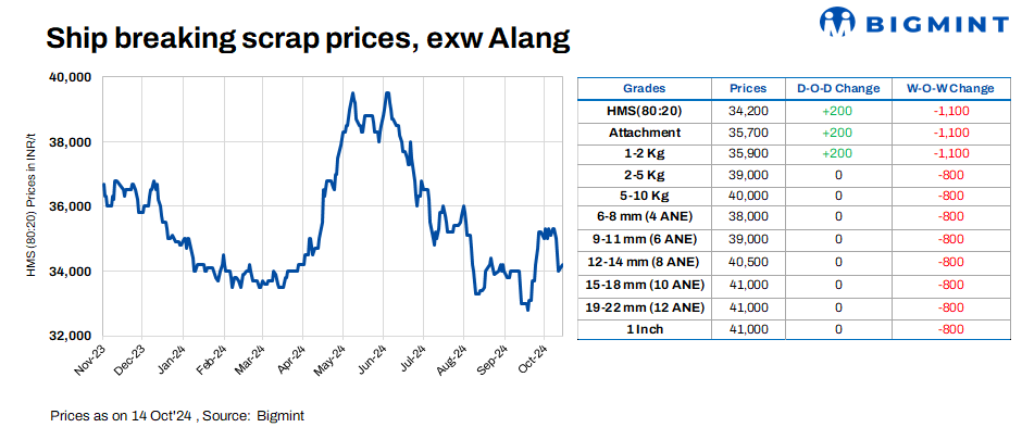 Ship-breaking melting scrap prices in Gujarat’s Alang market inched up by INR 200/t d-o-d on 14 Oct’24, as per BigMint’s assessment. HMS (80:20) prices were assessed at INR 34,200/t ($407/t) exy. Moderate demand for semi-finished and finished steel was observed during the previous trading session. This, along with decent buying inquiries for scrap from Bhavnagar-based mills, prompted suppliers to raise their offers today.
