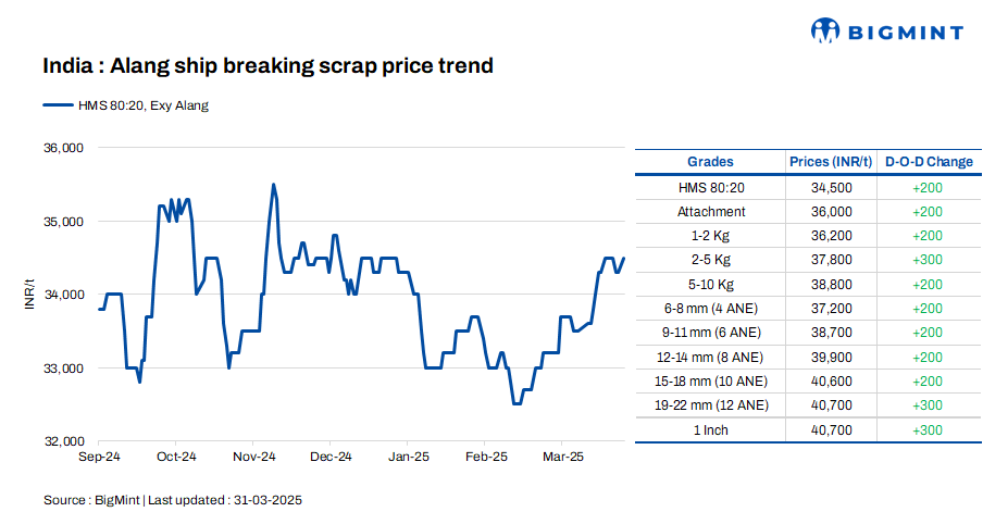 Ship-breaking melting scrap prices in Gujarat’s Alang market inched up by INR 200/t d-o-d on 31 Mar’25, as per BigMint’s assessment. HMS (80:20) stood at INR 34,500/t ($403/t) exy. Semi-finished and finished steel prices in the region increased by INR 100-200/t during the previous trading session. Additionally, a surge in buying inquiries for scrap led suppliers to adjust their offers upward today.