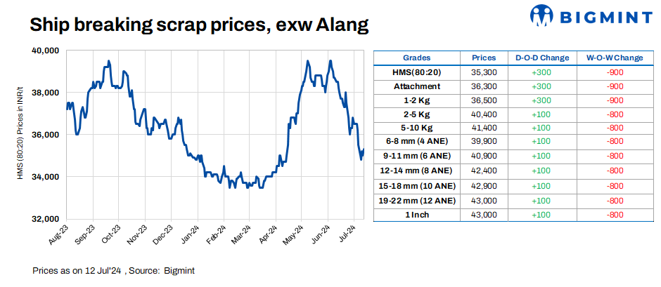 Ship-breaking melting scrap prices in Gujarat’s Alang market inched up by INR 300/t d-o-d on 12 Jul’24, as per BigMint’s assessment. HMS (80:20) prices were assessed at INR 35,300/t ($423/t) exy. Semi-finished steel prices increased by INR 100-300/t in the region during the late hours of yesterday’s trading session. Additionally, decent buying inquiries for scrap prompted suppliers to raise their offers today.