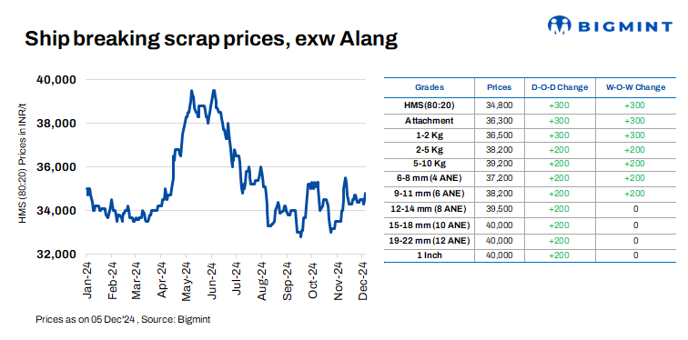 India’s ship-breaking melting scrap prices in Gujarat’s Alang market inched up by INR 300/t d-o-d on 5 Dec’24, as per BigMint’s assessment. HMS (80:20) stood at INR 34,800/t ($411/t) exy. Semi-finished steel prices in the region increased by INR 300-400/t during yesterday’s trading session. This, along with decent inquiries for scrap from Bhavnagar-based mills, prompted suppliers to raise their offers today.