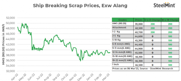 Ship-breaking melting scrap prices in Gujarat’s Alang market edged up by INR 200/t d-o-d on 6 Mar’23. As per SteelMint’s assessment, HMS (80:20) prices stand at INR 39,000/t ex-yard. An increase in semi-finished steel prices in the northern region and active scrap buying by Bhavnagar-based induction furnace mills in the last trading day prompted suppliers to raise offers.
