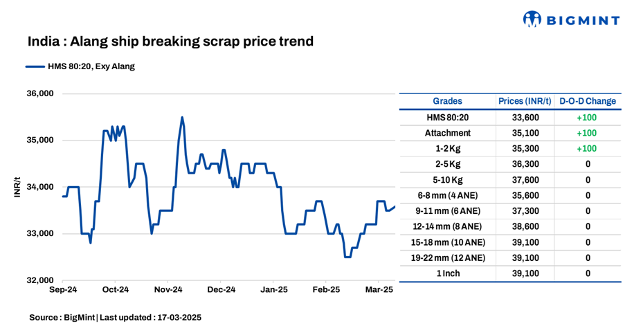 India’s ship-breaking melting scrap prices in Gujarat’s Alang market saw a d-o-d increase of INR 100/t on 17 Mar’25, according to BigMint’s assessment. HMS (80:20) was quoted at INR 33,600/t ($387/t) ex-yard. The region experienced moderate demand for both semi-finished and finished steel during the previous trading session. Additionally, steady inquiries for scrap from Bhavnagar-based mills encouraged suppliers to raise their offers today.