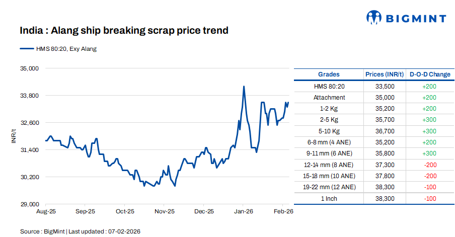 Ship-breaking melting scrap prices in Gujarat’s Alang market rose by INR 200/t d-o-d on 7 Feb’26, as per BigMint’s assessment. HMS (80:20) prices were assessed at INR 33,500/t ($370/t) exy. Trade activities in semi-finished and finished steel improved in the late hours of yesterday’s trading session in the region. Additionally, decent buying inquiries for scrap prompted suppliers to increase their offers today.
