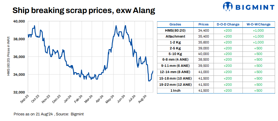 Ship-breaking melting scrap prices in Gujarat’s Alang market increased by INR 200/t d-o-d on 21 Aug’24, as per BigMint’s assessment. HMS (80:20) prices were assessed at INR 34,400/t ($410/t) exy. Moderate demand for semi-finished and finished steel was observed in the region during yesterday’s trading session. Combined with solid buying inquiries for scrap from Bhavnagar-based mills, this led suppliers to raise their offers today.