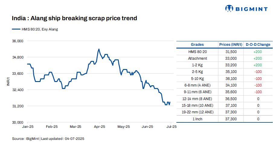 Ship-breaking melting scrap prices in Gujarat’s Alang market rose by INR 200/t d-o-d on 4 Jul’25, as per BigMint’s assessment. HMS (80:20) prices were assessed at INR 31,500/t ($367/t) exy. Trade activities in semi-finished and finished steel improved in the late hours of yesterday’s trading session in the region. Additionally, decent inquiries for scrap prompted suppliers to increase their offers today.