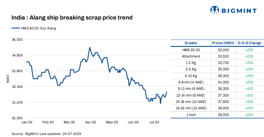Ship-breaking melting scrap prices in Gujarat’s Alang market rose by INR 200/t d-o-d on 24 Jul’25, as per BigMint’s assessment. HMS (80:20) prices stood at INR 32,000/t ($371/t) exy. The market saw an increase in inquiries for both semi-finished and finished steel in yesterday’s trading session, driving active demand for scrap. Consequently, scrap suppliers adjusted their pricing in response to the increased buying interest.