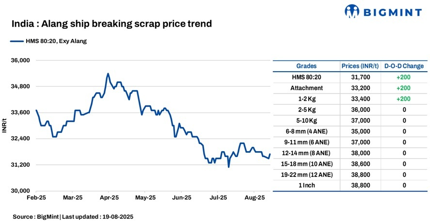 Ship-breaking melting scrap prices in Gujarat’s Alang market inched up by INR 200/t d-o-d on 19 Aug’25, as per BigMint’s assessment. HMS (80:20) prices were assessed at INR 31,700/t ($363/t) exy. Semi-finished steel prices increased by INR 100-200/t in the region during the previous trading session. Additionally, decent inquiries for scrap prompted suppliers to raise their offers today.