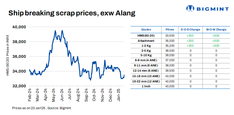 Ship-breaking melting scrap prices in Gujarat’s Alang market rose by INR 300/t d-o-d on 23 Jan’25, as per BigMint’s assessment. HMS (80:20) prices stood at INR 33,500/t ($388/t) exy. Moderate trade activities were observed for semi-finished and finished steel in the late hours of yesterday’s trading session. This, along with active buying inquiries for scrap, prompted suppliers to raise their offers today.