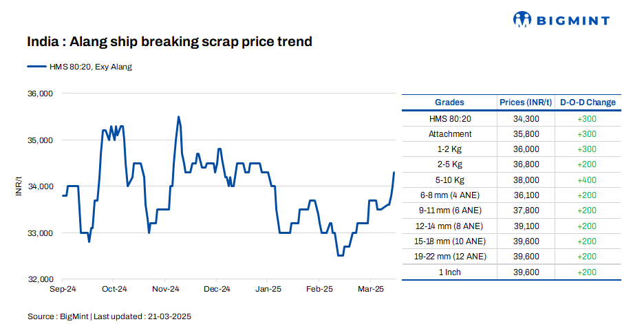 Ship-breaking melting scrap prices in Gujarat’s Alang market rose by INR 300/t d-o-d on 21 Mar’25, as per BigMint’s assessment. HMS (80:20) stood at INR 34,300/t ($398/t) exy. Semi-finished and finished steel prices climbed up by INR 200-300/t in yesterday’s trades. This price rise, alongside heightened scrap buying activity, drove suppliers to raise their offers today.