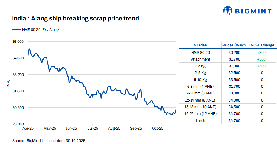 Ship-breaking melting scrap prices in Gujarat’s Alang increased by INR 300/t d-o-d on 30 Oct’25, as per BigMint’s assessment. HMS (80:20) prices were assessed at INR 30,200/t ($341/t) exy. Semi-finished and finished steel prices increased by INR 200-400/t in the region during yesterday’s trading session due to active trade inquiries. The improvement in buying sentiment encouraged suppliers to lift scrap offers today.