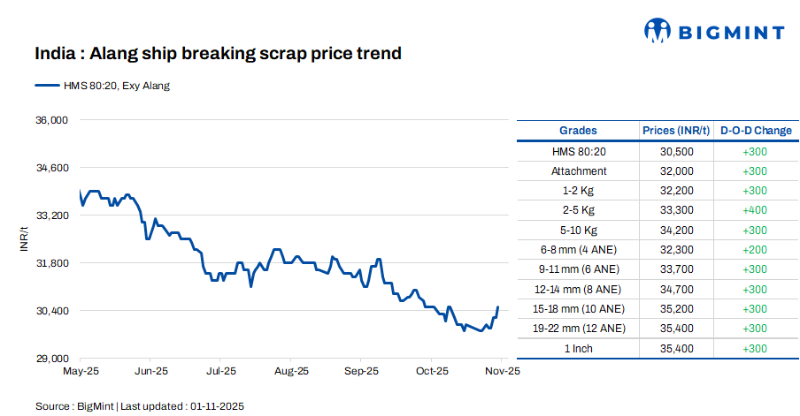 Ship-breaking melting scrap prices in Gujarat’s Alang increased by INR 300/t d-o-d on 1 Nov’25, as per BigMint’s assessment. HMS (80:20) prices were assessed at INR 30,500/t ($344/t) exy. The regional semi-finished and finished steel market saw prices rise by INR 300-500/t amid increased trading activity. This along with moderate trade activities for scrap, prompted suppliers to raise their offers today.