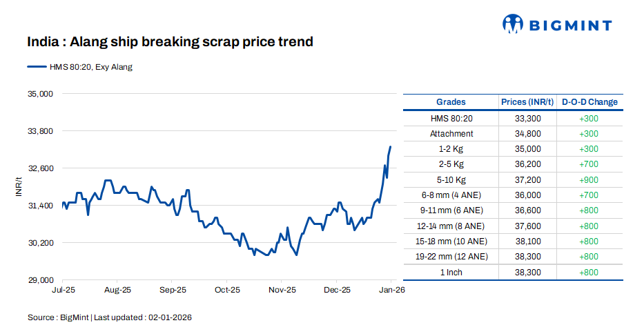 Ship-breaking melting scrap prices in Gujarat’s Alang increased by INR 300/t d-o-d on 2 Jan’26, as per BigMint’s assessment. HMS (80:20) prices were assessed at INR 33,300/t ($370/t) exy. The regional market witnessed active trading, supported by an INR 500-800/t spurt in semi-finished and finished steel prices. Additionally, improved buying inquiries for scrap prompted suppliers to raise their offers today.