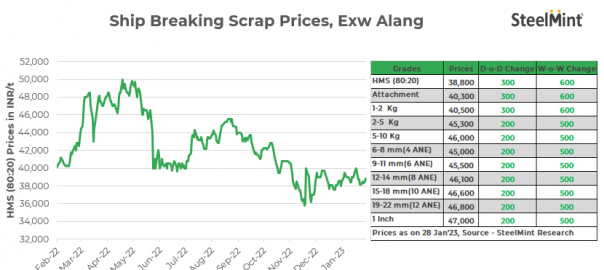 Ship-breaking melting scrap prices in Gujarat’s Alang market rose by INR 300/t d-o-d on 28 Jan’23. As per SteelMint’s assessment, HMS (80:20) prices stand at INR 38,800/t ex-yard. An uptick in semi-finished steel prices in yesterday’s trading session and moderate demand for scrap from the induction furnace steel mills in Bhavnagar supported scrap offers.