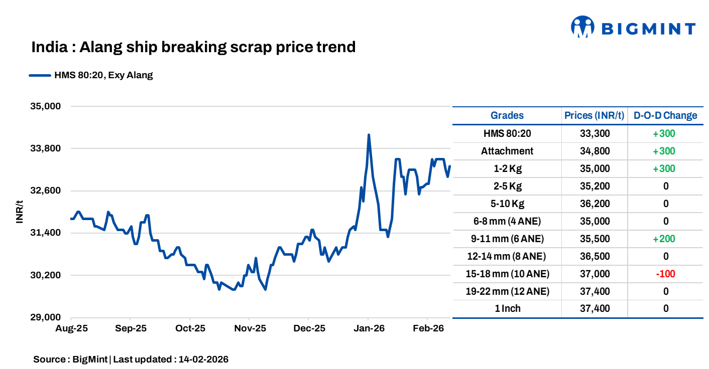 Ship-breaking melting scrap prices in Gujarat’s Alang market rose by INR 300/t d-o-d on 14 Feb’26, as per BigMint’s assessment. HMS (80:20) prices were assessed at INR 33,300/t ($368/t) exy. Trade activities in semi-finished and finished steel improved in the late hours of yesterday’s trading session in the region. Additionally, decent buying inquiries for scrap prompted suppliers to increase their offers today.