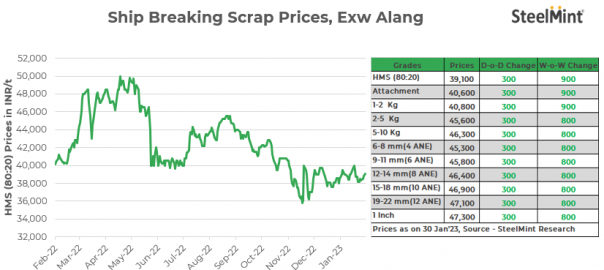 Ship-breaking melting scrap prices in Gujarat’s Alang market increased by INR 300/t d-o-d on 30 Jan’23. As per SteelMint’s assessment, HMS (80:20) prices are at INR 39,100/t ex-yard. Moderate trade in semis and finished steel segments in western region as well as active buying of scrap from the Bhavnagar-based induction furnace steel mills prompted scrap suppliers to hike their offers.