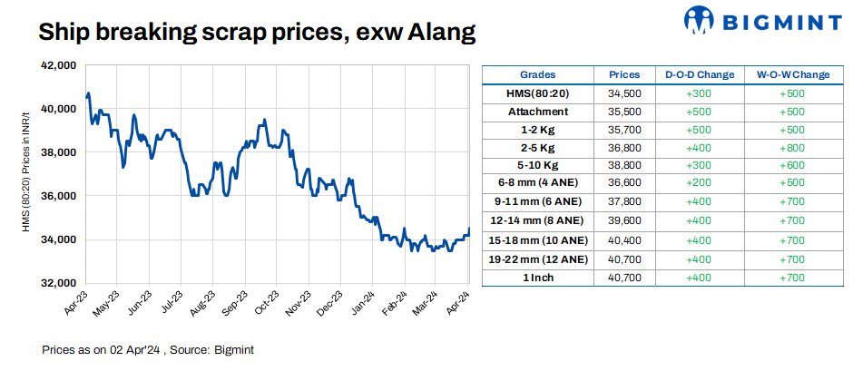 Ship-breaking melting scrap prices in Gujarat’s Alang increased by INR 300/t d-o-d on 2 Apr’24, as per BigMint’s assessment. HMS (80:20) prices were assessed at INR 34,500/t exy. Semi-finished steel prices increased by INR 500/t in the region along with active buying inquiries for scrap by the Bhavnagar-based IF steel mills which prompted suppliers to improve their offers today.