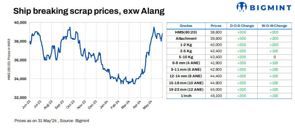Ship-breaking melting scrap prices in Gujarat’s Alang increased by INR 300/t d-o-d on 31 May’24, as per BigMint’s assessment. HMS (80:20) prices were assessed at INR 38,800/t ($466/t) exy. During yesterday’s trading session, semi-finished steel prices rose in the region. Furthermore, active buying inquiries for scrap from induction furnace mills in Bhavnagar, Gujarat, led scrap suppliers to increase their offers today.