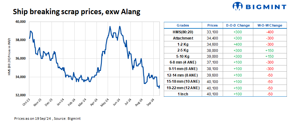 Ship-breaking melting scrap prices in Gujarat’s Alang market rose INR 300/t d-o-d on 19 Sep’24, as per BigMint’s assessment. HMS (80:20) prices were assessed at INR 33,100/t ($396/t) exy. Active demand for semi-finished and finished steel was observed in the region during yesterday’s trading session. Additionally, decent buying inquiries for scrap from Bhavnagar-based mills led suppliers to raise their offers today.