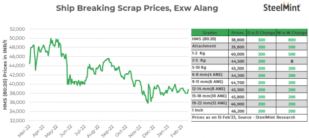 Ship-breaking melting scrap prices in Gujarat’s Alang market rose by INR 300/t d-o-d on 15 Feb’23. As per SteelMint’s assessment, HMS (80:20) prices stand at INR 38,800/t ex-yard. An uptick in semi-finished steel prices in yesterday’s trading session and moderate demand for scrap from the induction furnace steel mills in Bhavnagar supported scrap offers.