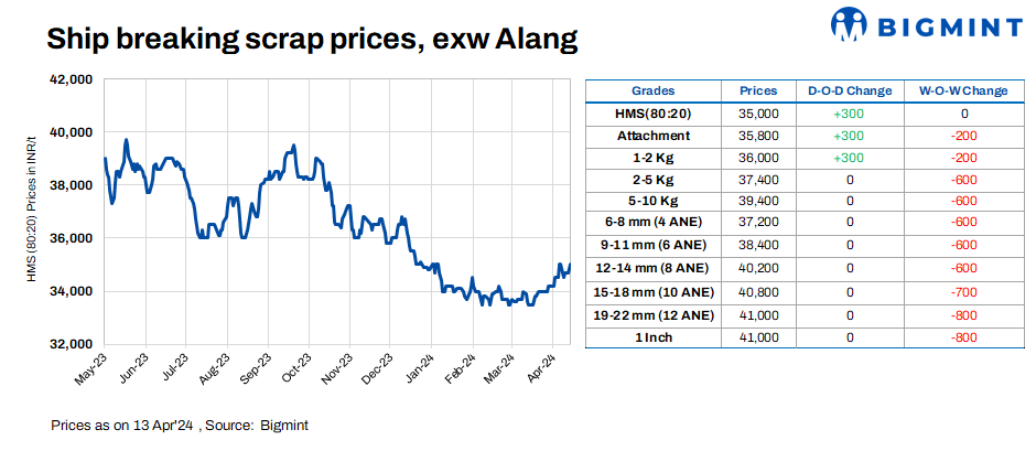 Ship-breaking melting scrap prices in Gujarat’s Alang increased by INR 300/t d-o-d on 13 Apr’24, as per BigMint assessment. HMS (80:20) prices were assessed at INR 35,000/t ($419/t) exy. Trade activities in semi-finished and finished steel increased in the late hours of yesterday’s trading session in the region, accompanied by active buying inquiries for scrap. This prompted suppliers to increase their offers today.