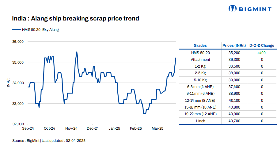 Ship-breaking melting scrap prices in Gujarat’s Alang increased by INR 400/t d-o-d on 2 Apr’25, as per BigMint’s assessment. HMS (80:20) stood at INR 35,200/t ($411/t) exy. Semi-finished and finished steel prices increased by INR 300-500/t in the region during yesterday’s trading session. Additionally, decent inquiries for scrap prompted suppliers to raise their offers today.