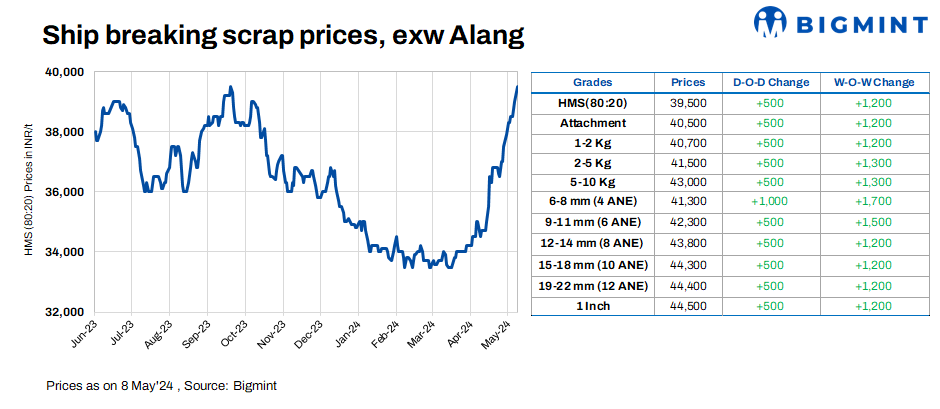 Ship-breaking melting scrap prices in Gujarat’s Alang increased by INR 500/t d-o-d on 8 May’24, as per BigMint’s assessment. HMS (80:20) prices were assessed at INR 39,500/t ($473/t) exy. Trade activities in semi-finished and finished steel were at a moderate level in yesterday’s session due to the assembly elections in the region. Meanwhile, a shortage of scrap still persists in the market.