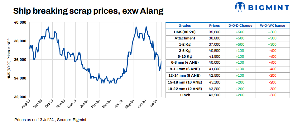 Ship-breaking melting scrap prices in Gujarat’s Alang market increased by INR 500/t d-o-d on 13 Jul’24. HMS (80:20) prices were assessed at INR 35,800/t ($429/t) exy. During yesterday’s trading session, semi-finished and finished steel prices rose in the region. Furthermore, active buying inquiries for scrap from induction furnace mills in Bhavnagar led scrap suppliers to increase their offers today.