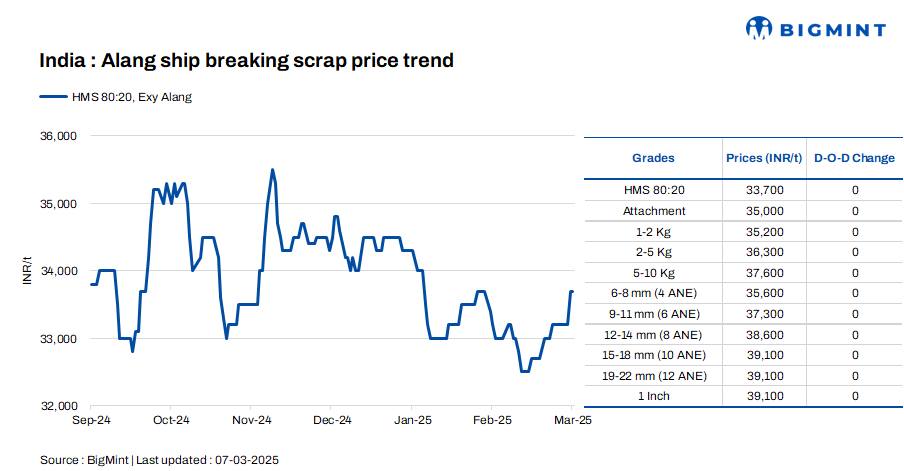 Ship-breaking melting scrap prices in Alang, Gujarat, remained stable d-o-d on 7 Mar’25. According to BigMint’s assessment, HMS (80:20) prices were at INR 33,700/t ($387/t) ex-yard. Semi-finished and finished steel prices remained steady in yesterday’s trading session in the region. This, along with moderate trade activity in the scrap market, led suppliers to maintain stable pricing today.